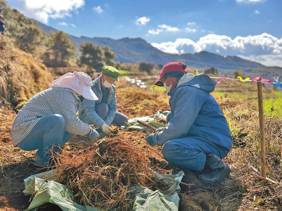 近日,由青海大学、云南省农业科学院、西南林业大学、大理白族自治州农科院药植所、巍山彝族回族自治县农业技术推广服务中心组成的专家组,在巍山县马鞍山乡红旗村、三胜村实收测产当归产量。