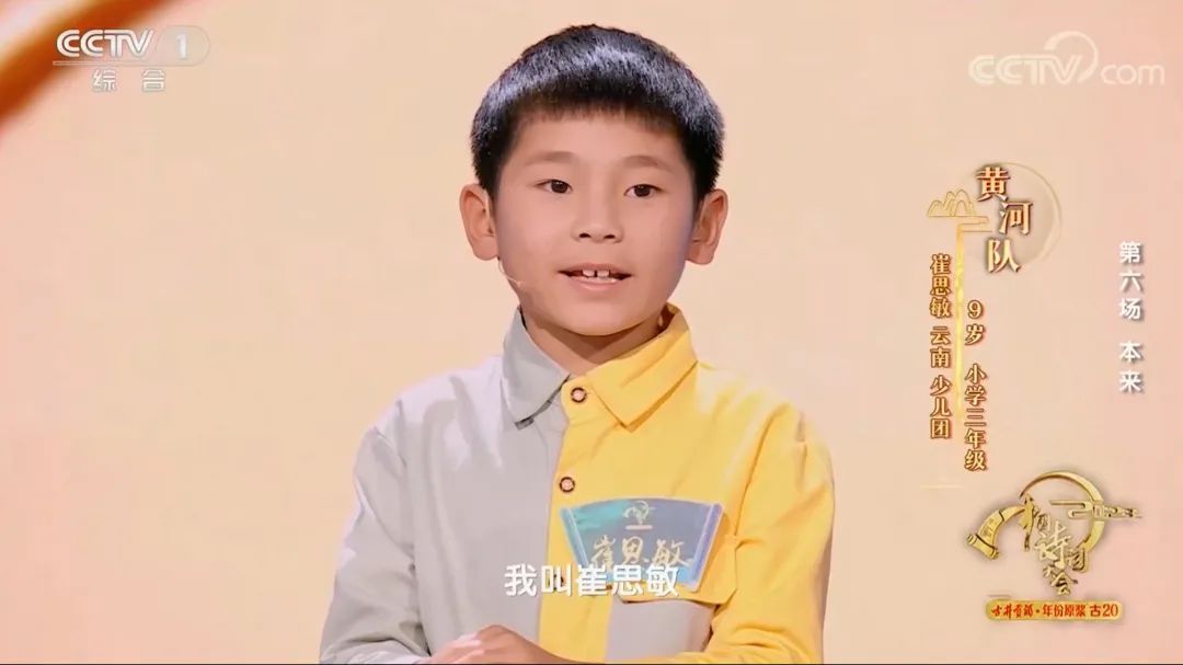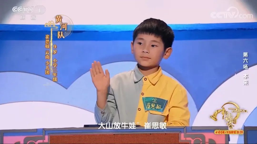 在中央广播电视总台《2023中国诗词大会》比赛现场,黄河队一位9岁的小选手气定神闲,收放自如地回答主持人和嘉宾老师所出的每一道诗词题,最终收获了两枚金徽章。他就是来自宾川县拉乌完小的学生崔思敏。
