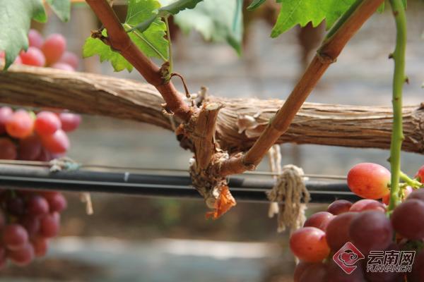 炎炎夏日,阳光灼热地炙烤着大地,走进大理白族自治州宾川县宏源农副产品产销专业合作社,来到菜甸村一期合作农场,缀满葡萄架的红色“玛瑙”就映入了人们眼帘,葡萄架上,正孕育着今夏极致的甜蜜。“这是‘中国红玫瑰’,这个是由原来的红提嫁接出来的,甜度保持在18度左右,要受色均匀后才能走入高端市场。”宾川县农业农村局副局长杨建军一边指着嫁接的地方,一边饶有兴趣地向大家介绍道。