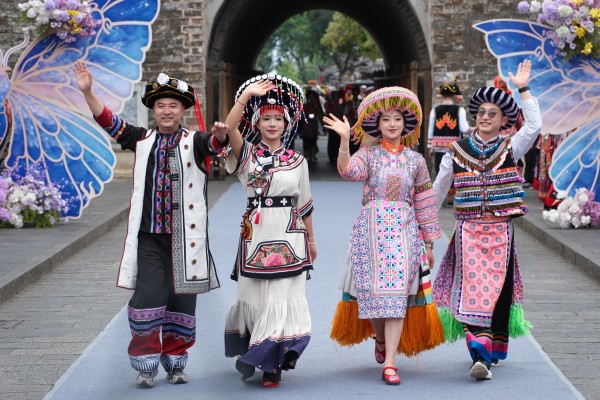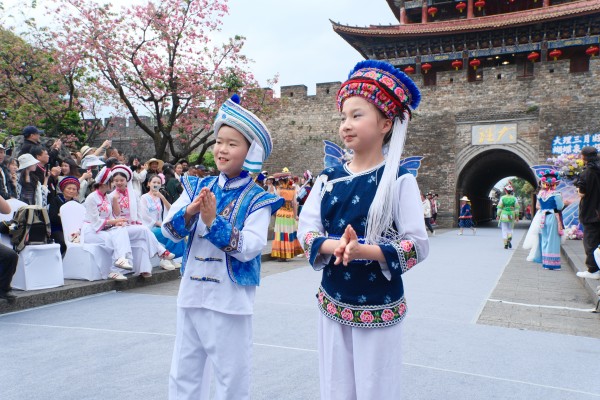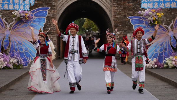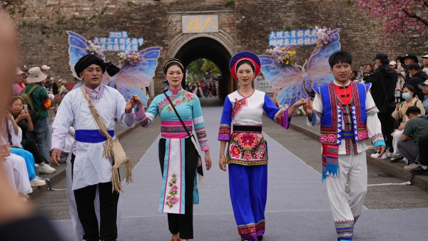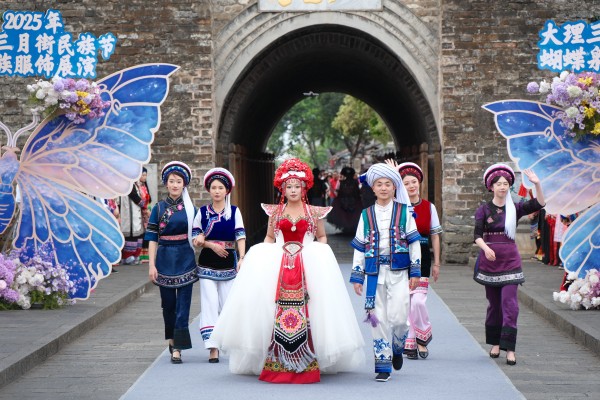 4月12日,以“大理三月好风光,蝴蝶泉边好梳妆”为主题的2025年三月街民族节服饰展演活动在大理古城南门城楼举办。此次展演汇聚大理州12县市各具特色的民族婚庆服饰48套,以及创意白族服饰26套,织就一幅绚丽的民族风情画卷。