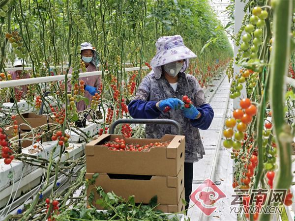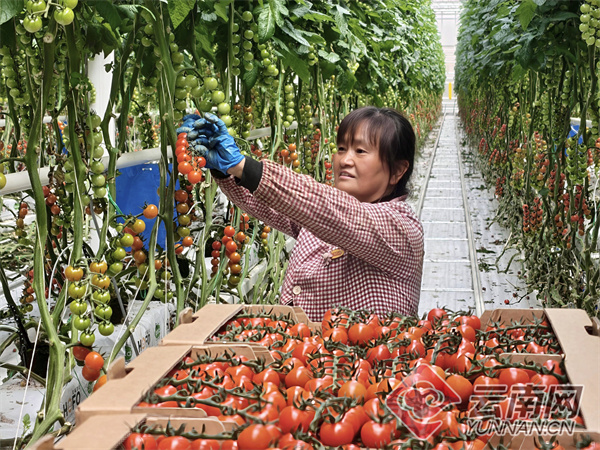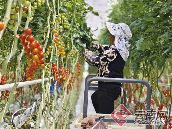 走进位于洱源县茈碧湖镇永联村的云南大理宏福现代农业产业园,10万平方米的智能连栋温室内,一排排番茄植株的半直立茎粗壮结实,翠绿的枝叶间缀满一串串饱满诱人的小番茄,工人们操作着各类作业车在轨道上穿行,分工细致地进行着盘头、疏花、打叶、采收等各项工作。每天约有10吨小番茄从这座“番茄工厂”里产出,运往全国各地一线城市的商超,全年产量预计达到3000吨。