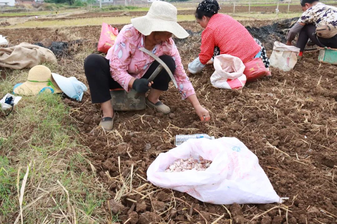 清水河村的农户杨玉宣一边麻利地播种,一边笑着说:“刚收完水稻就赶着种新蒜。今年我买了8袋蒜种,计划种3亩大蒜!土地流转规模种植后,我们把土地租出去能拿租金,收了水稻还能继续种大蒜,一年四季都有钱赚!”