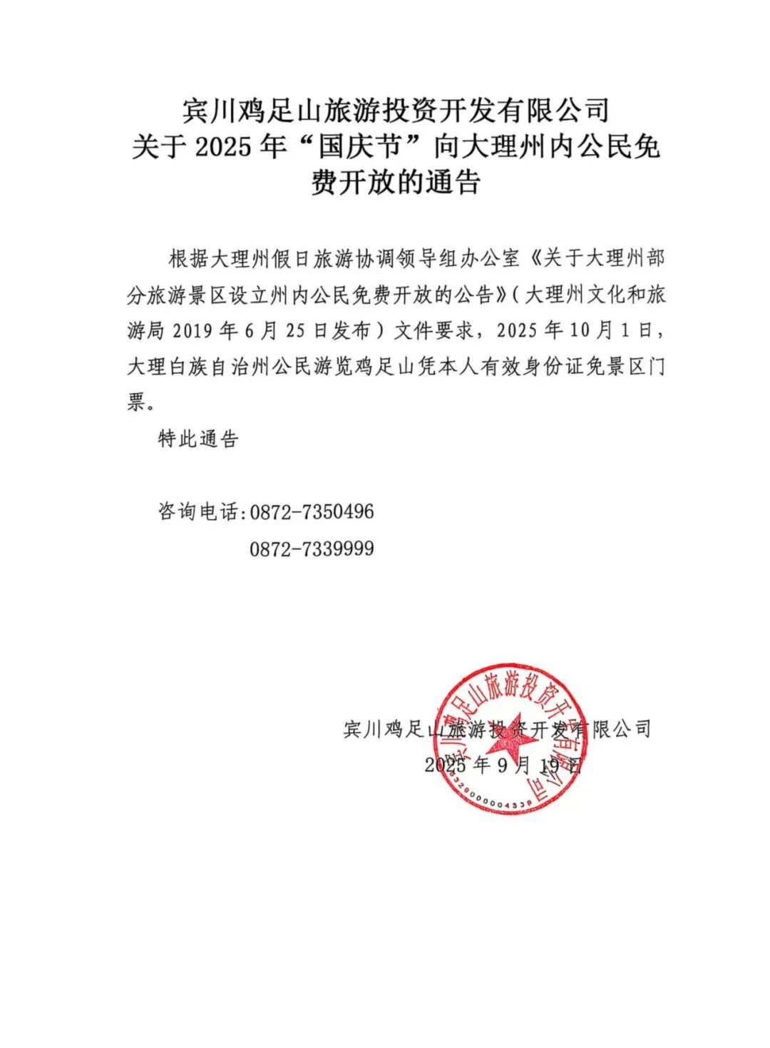 根据大理州假日旅游协调领导组办公室《关于大理州部分旅游景区设立州内公民免费开放的公告》(大理州文化和旅游局2019年6月25日发布)文件要求,2025年10月1日,大理白族自治州公民游览鸡足山凭本人有效身份证免景区门票。