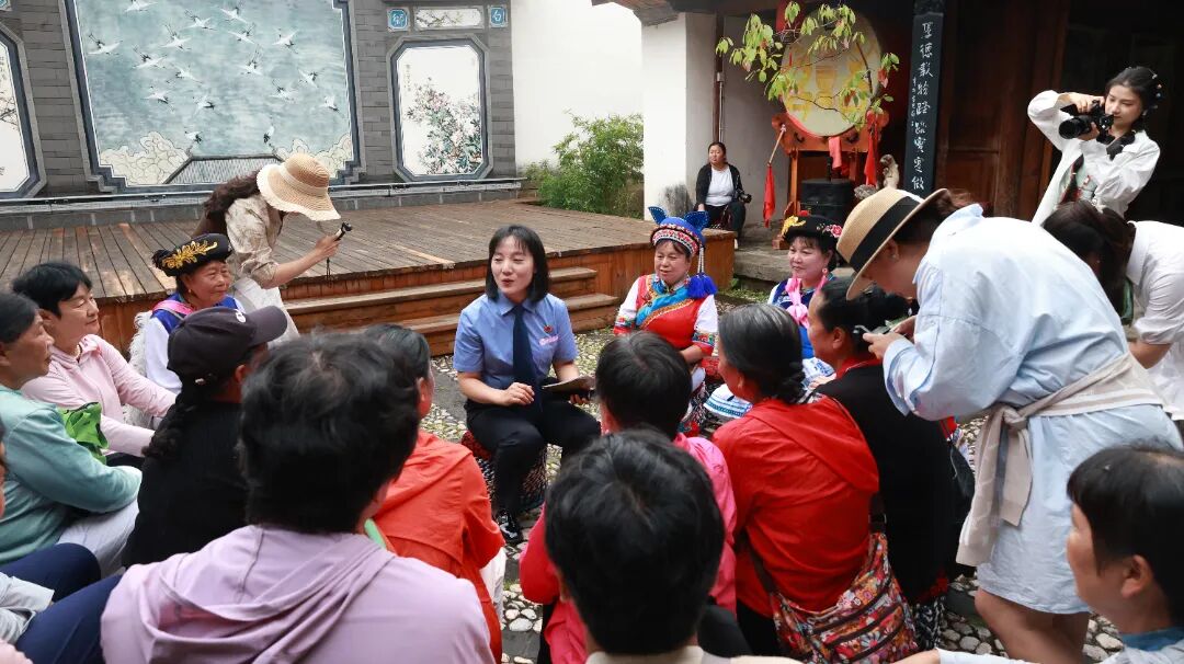 在剑川县,采访团首先参观了剑川古城西门街家风楹联文化,与省级书香家庭何继东家庭进行了交流。在国家方志馆南方丝绸之路分馆,金花宣讲团成员生动地宣讲了南方丝绸之路在商贸往来、文化交流等方面的历史,以及其在铸牢中华民族共同体意识方面的重要作用。在赵式铭故居,采访团观摩了大理苍洱“金花”宣讲团以白族大本曲的方式开展宣讲,了解了巾帼宣讲员在解读政策、引领妇女思想等方面的生动实践。