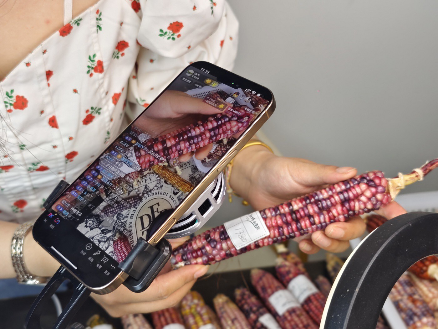 “家人们快看!这根玉米籽粒饱满、色泽通透,纹路也很独特,有喜欢的吗?”午后,漾濞玉淑坊时尚饰品工作室的直播间里热闹非凡,主播手持当地特产的彩色玉米,引得观众纷纷留言:“有没有更直的?”“想看看其他颜色!”