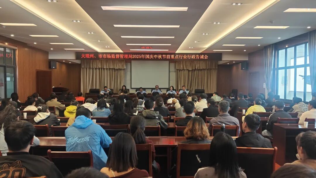 9月26日,大理州、市市场监督管理局召开2025年国庆中秋节前重点行业行政告诫会,提醒、告诫重点经营单位遵纪守法、诚信经营、文明服务。