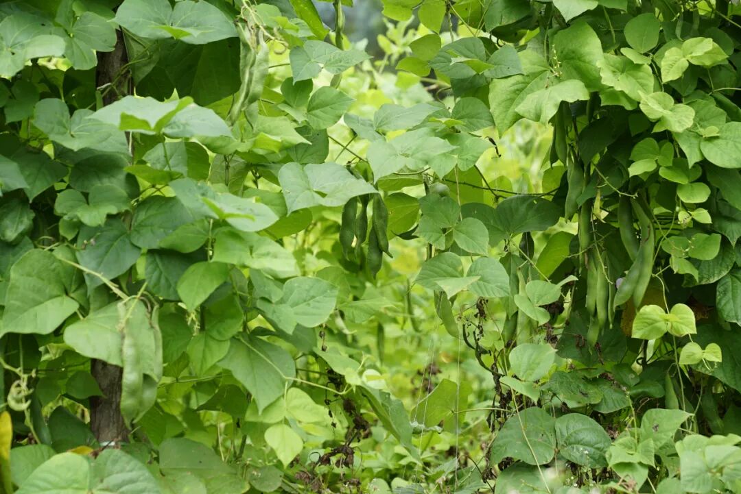 在清水沟的白芸豆种植基地,一串串饱满的白芸豆挂满枝头,这是今年首批成熟的白芸豆,种植户们正忙着采摘、装袋。西村村民左瑔背着竹筐在地埂上穿梭,他轻轻拨开豆叶,熟练地将成熟的豆荚摘下。