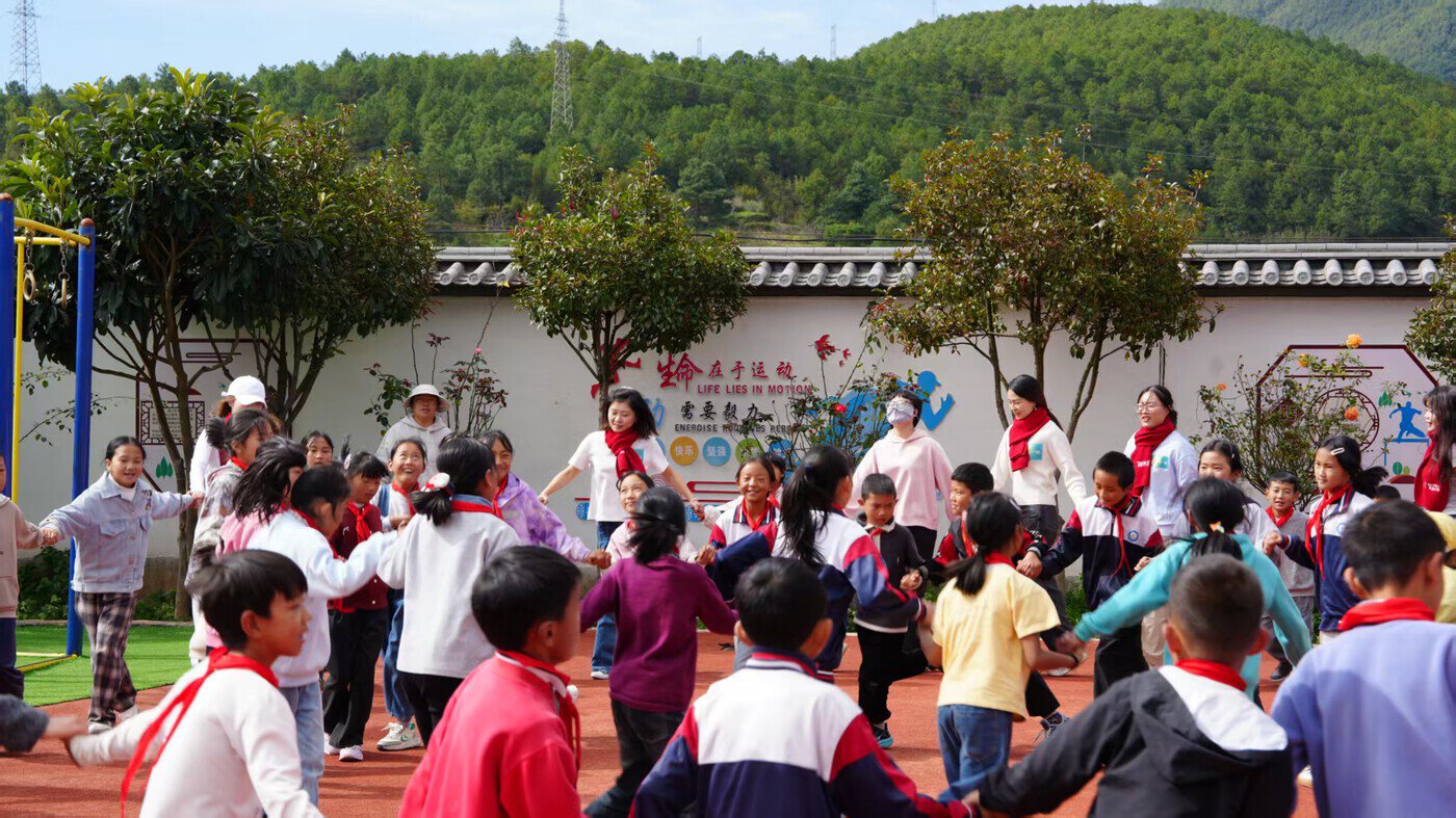 活动期间,公益团队的行动兼具温度与实效。志愿者首先为孩子们送去了精心准备的物资,包括120余套文具、30余个篮球足球、50把雨伞等实用物品,覆盖学习与生活场景;随后,志愿者深度融入校园日常,与孩子们开展多维度互动:心理课堂上,志愿者结合自身童年经历,分享“如何克服孤独感”“怎样调节负面情绪”等真实故事,鼓励孩子们主动表达内心想法;课后,志愿者与孩子们手拉手跳白族传统舞蹈、一同在学校食堂用餐,还在国旗下组织“信任之旅”互动游戏,孩子们蒙眼牵手跨越障碍,在协作中体验信任的价值,逐步建立心理安全感。