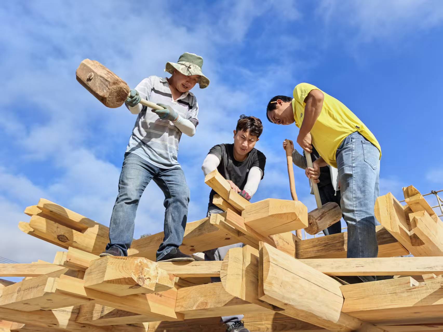 老木匠眯着眼调整梁柱角度,年轻人灵活地攀上木架固定着榫卯节点,木锤敲击榫头的声响清脆悦耳;壮年汉子们分组拉着稳固木架的麻绳,手臂肌肉随着“一二三”的号子声绷紧;不时传来“小心接住!”“往左挪半寸!”的呼应声。