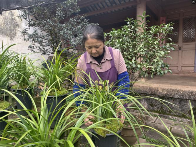 今年57岁的银河村村民张琼芬在自家院子里栽了五十多盆兰花。兰花不仅能产生经济收入,还能增加绿意。她说:“现在村子里的环境比以前好太多啦。以前大家会把垃圾到处乱扔,风大的时候,到处都是塑料袋。现在这些东西都看不见啦!”