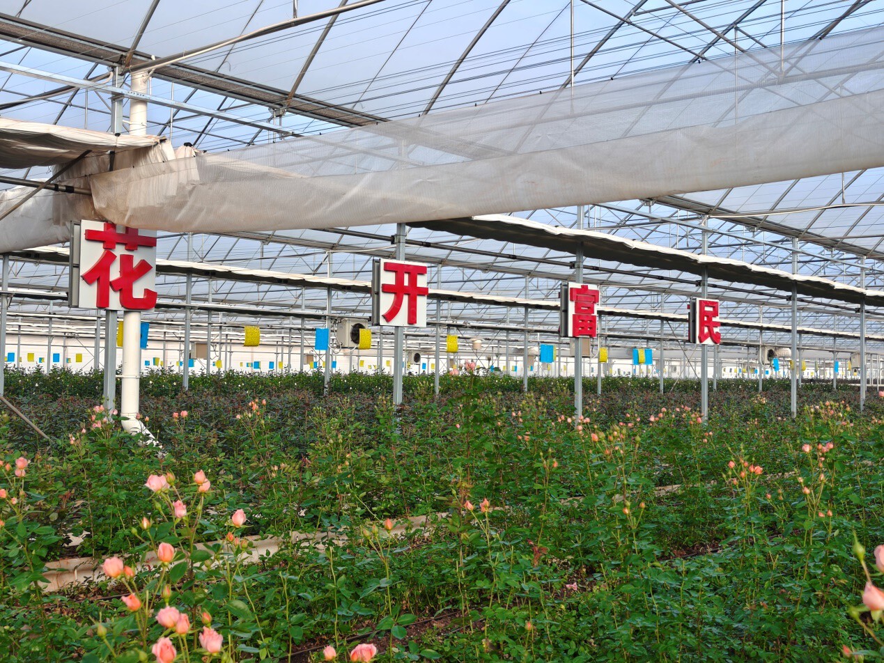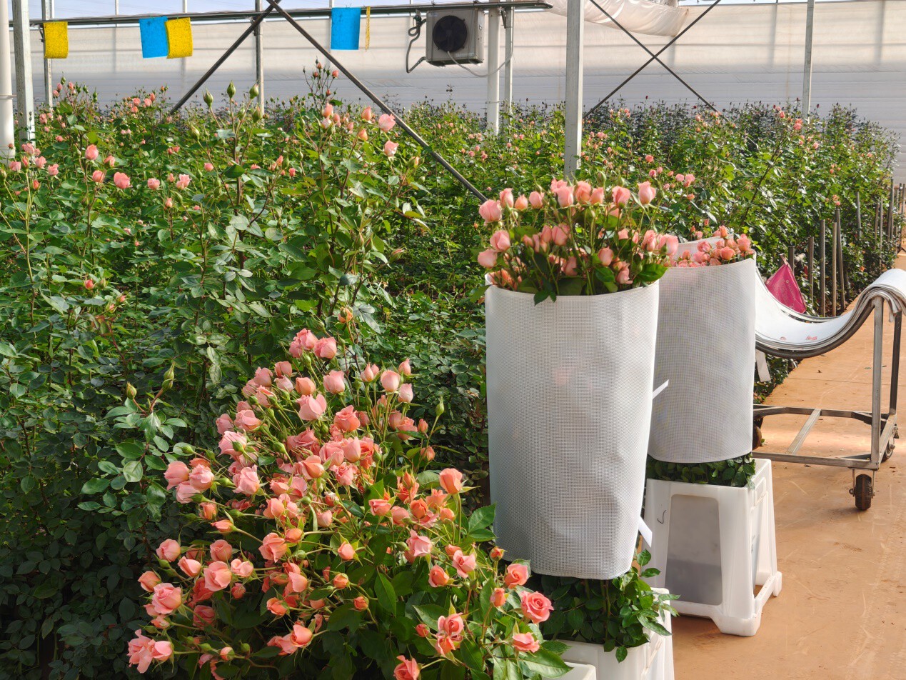 园区目前建成鲜切花基地188亩,从今年3月开始陆续出花,有近20个品种的月季,每天产出5万支鲜切花,每个月产值150万元左右。