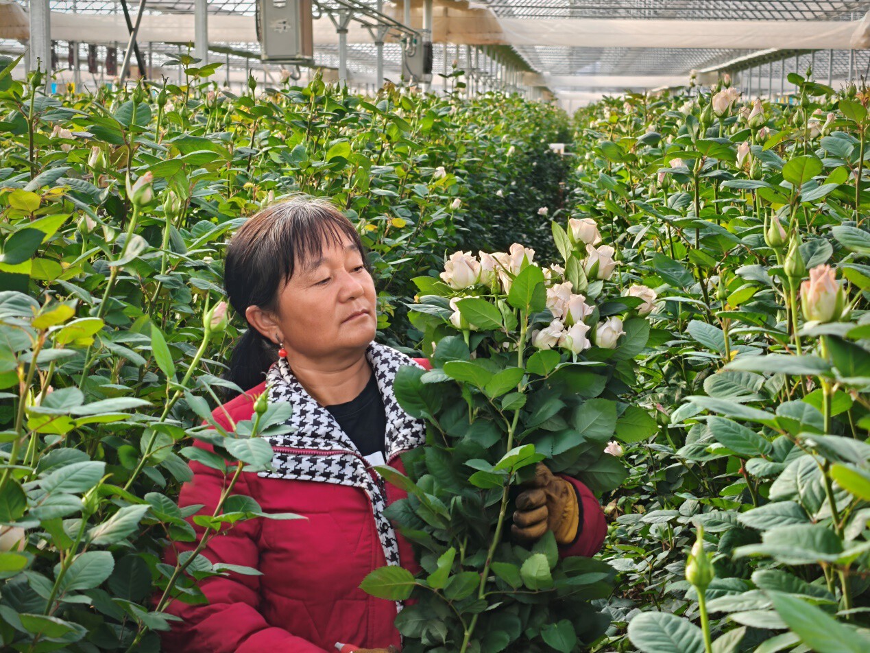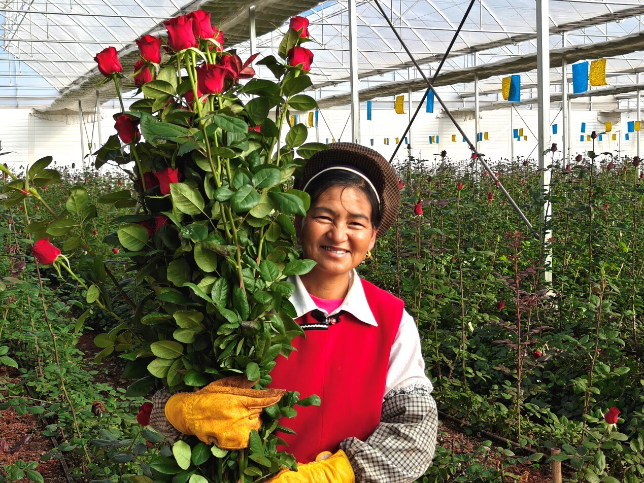 来自附近松桂镇的碧付妞,是最早到基地承包种植的一批花农,近期,她负责的片区每天出产4000多支鲜花,一个人忙不过来,她还请了一个人帮忙。“我原先在家没有经济来源,得知这里在发展产业后,从基地建设开始就过来了,通过管理、采收鲜花,目前收入状况比较理想。”碧付妞说。