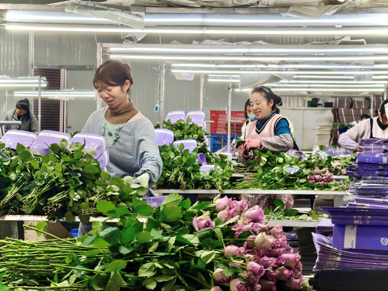 花农穿梭在一排排茁壮油绿的花枝间,不一会儿就采摘了一大捧月季。在专业的采后保鲜处理中心,鲜花经过分拣、包装,再由冷链车运到昆明国际花拍中心。