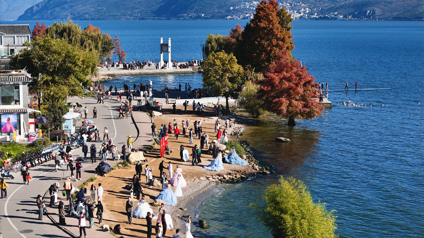 冬日的洱海生态廊道,层林尽染。绯红的水杉倒映在澄澈湖面,成群的海鸥盘旋翻飞,赤麻鸭在浅草滩栖息,廊道上游人如织,共享湖光山色。廊道沿线,停车场、民宿客栈、咖啡厅、旅拍等多样业态兴起,成就诗意富足的生活。身处大理这座国际湿地城市,人与自然和谐共生已成日常,这正是洱海保护治理释放生态红利的生动写照。