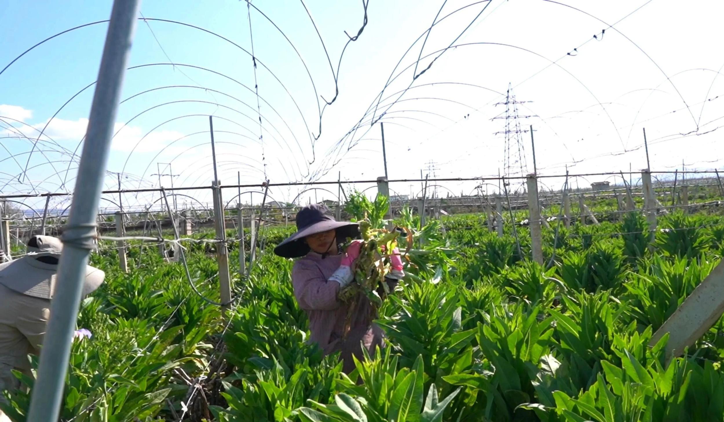 在金牛镇彩凤村委会百户长小组,代力刚和家人正在采收套种在葡萄园里的贡菜。周边大片田野里,有许多套种在葡萄园、石榴园中的贡菜,长势都很好。