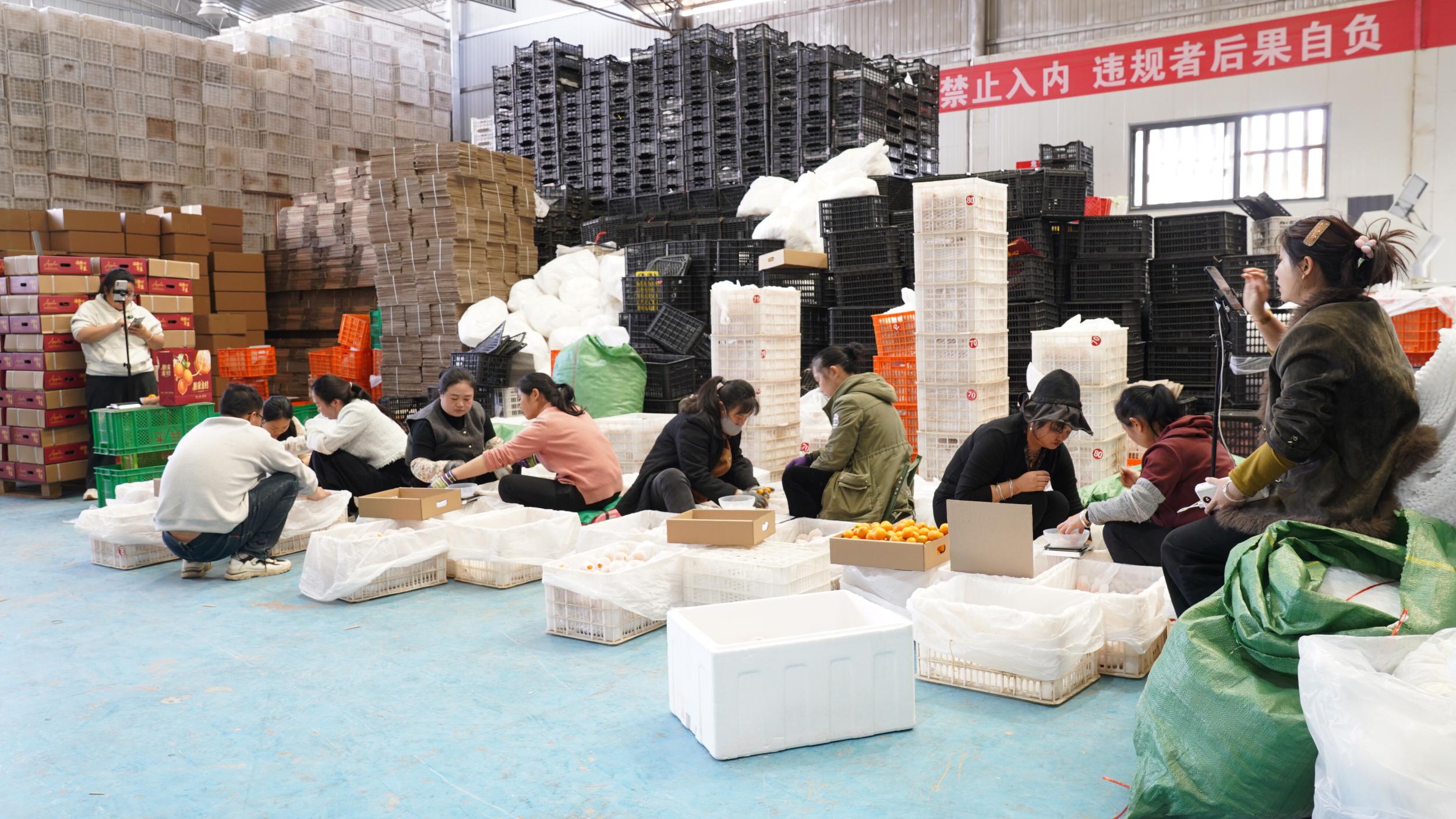 主播们在镜头前全力以赴,仓库里更是热火朝天。工人们分工明确,分拣、打包、贴单、称重,一道道工序有条不紊,新鲜采摘的水果经过精心打包,迅速发往全国各地,确保消费者第一时间尝到宾川的清甜滋味。