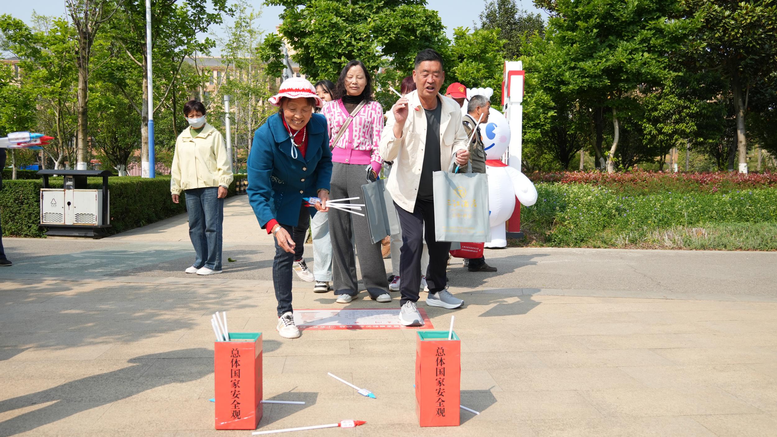 最具人气的还属总体国家安全观主题公园趣味游园活动,投壶问“安”、转盘问答、眼力考验、快问快答等互动游戏,将国家安全知识巧妙融入其中,群众排队参与,闯关赢奖,现场气氛热烈。其中,“非遗甲马拓国安·游园打卡赠饮品”活动更是独具特色,群众在祥云特色非遗宣传甲马上拓印宣传图片,让非遗与国家安全教育相结合,群众体验传统技艺的同时,学习国家安全大事记与核心知识。