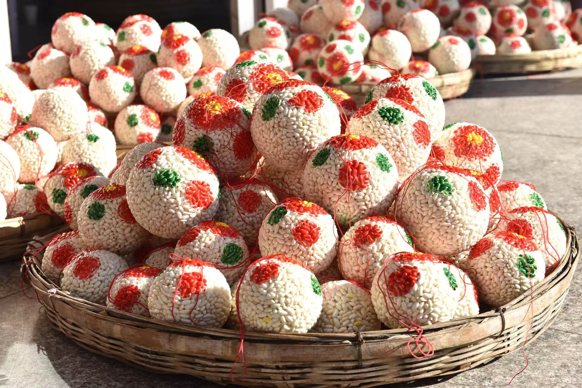 据危琼仙介绍,米花糖制作工序繁复:首先要选用当地优质大米,通过炸花机将大米炸成米花;随后将麦芽糖熬制成糖浆,与米花混合拌匀;再用瓷盅、瓷碗等模具将米花定型成大小不一的圆球,并点染红、黄、绿三色;最后经过晾晒干燥,即可上市销售。整个流程包括选米、晒米、炸米花、熬糖、搅拌、定型、上色、晾晒等多道工序。这门传承数百年的手工技艺,因米花糖寓意吉祥、团圆与红火,深受各地消费者喜爱。