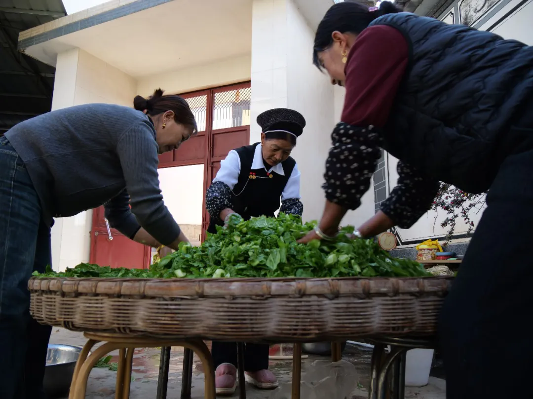 一方水土养一方味。冬季,正是腌制酸菜的最佳时机。清早,云南省大理白族自治州鹤庆县坝子的晨霜还未散尽,簸箕上铺开的菜叶带着霜气渐渐舒展,经过两天自然霜冻的青菜在太阳的照耀下显得更加脆嫩,欢声笑语中,几位白族妇女围在一起,一场关于“酸香”的味觉盛宴正式拉开序幕。