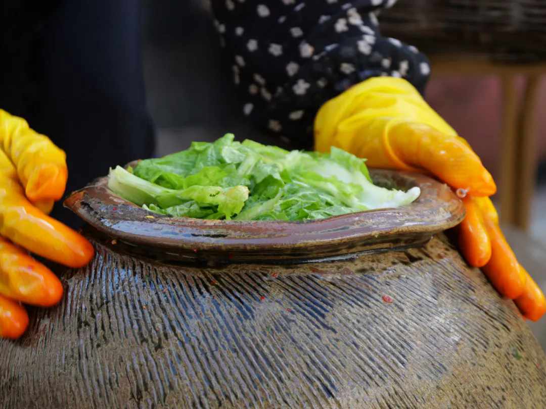 装坛是整套工艺的“灵魂”所在,一人负责将菜装入洗净晾干的陶罐,另一人则负责将菜层层压紧,装满后用干净菜叶封口,并用袋子绑实,压上石块,置于通风阴凉处,在接下来的15至20天里,静待时光催化、风味升华。