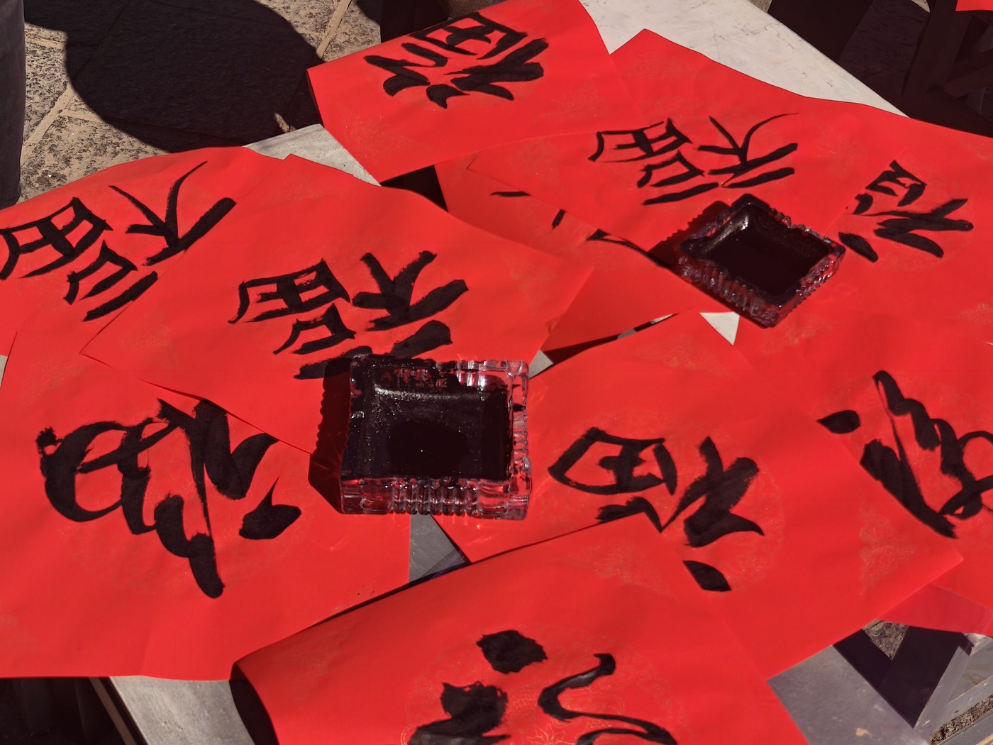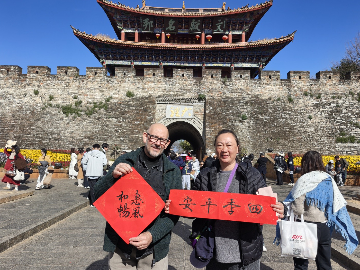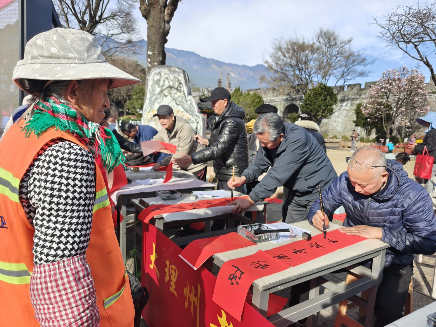 大理古城南门城楼是古城地标建筑之一,城楼前游人如织,一幅幅手写春联将大理的祝福送到游客手中,让更多人感受到文献名邦的文脉底蕴。不一会儿,场地上就铺满了写好的春联,空气中纸墨飘香,阳光下,等待墨迹干透的每个人都喜气洋洋。大理州老干部诗书画家协会秘书长赵傣表示:“我们很高兴能用笔墨把祝福传递给大家,写福字、送春联,既是为市民游客送上新春祝福,更是希望让传统文化在景区‘活’起来。”