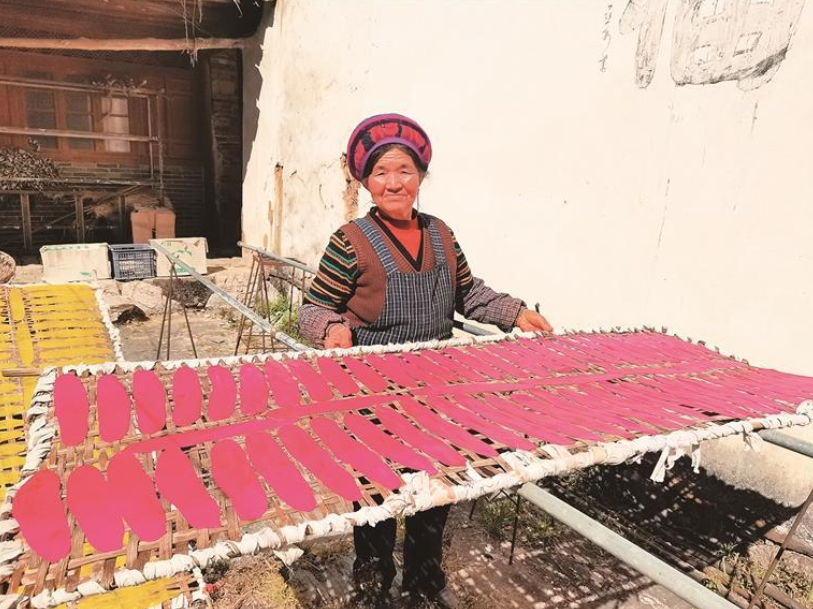 倪大妈二十多岁就开始做干栏,每逢集市就背去售卖为家庭增加经济收入。如今她已经70岁了,一双儿女也成家立业,但她仍不肯休息。每天清晨,老伴帮她把20斤左右的米粉蒸熟、揉团,染成红、黄、绿三种颜色,把米粉团装进塑料袋里保湿、保温,然后就是倪大妈的“主场”,擀压、晾晒干栏片。