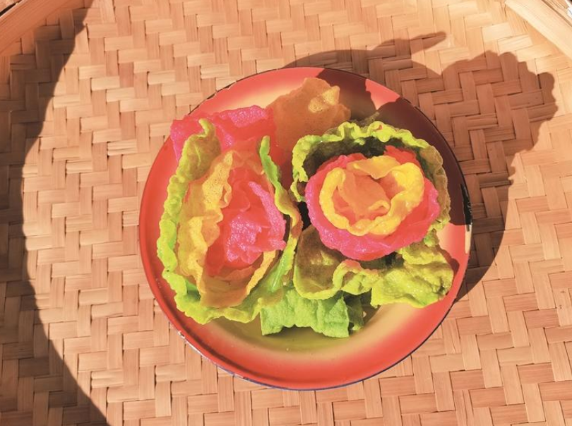 白族人家大年初一有着祭祀祈福的传统,炸干栏必不可少。把干栏片放进油锅,边炸边卷,卷成一朵花的形状,加上颜色鲜艳,看起来十分喜庆。祭祀过后,一家人就可以分食炸干栏,寓意“沾福气”。而且,一些白族人家还有大年初一吃汤圆、吃素食、喝甜汤等传统习俗,把炸干栏捏碎,或与核桃、红糖、橘皮等一起拌入馅料、甜汤里,吃上一口甜滋滋,暖胃暖心;或与豆腐、豆芽、莴笋丝、香菇等蔬菜一起做成浇头,盖在素面、饵丝上,寓意新的一年“清白做人”“红火度日”。